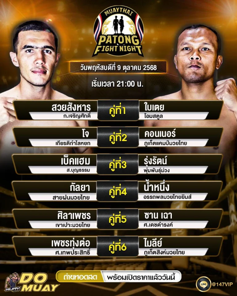 โปรแกรมมวย 9-10-68 MUAYTHAI PATONG FIGHTNIGHT วันพฤหัสบดีที่ 9 ตุลาคม 2568 เริ่มเวลา 21:00 น. ครบเครื่อง ทั้งเชิงคลาสสิก มวยวงนอกสปีดจัด และมวยบู๊ดุดัน